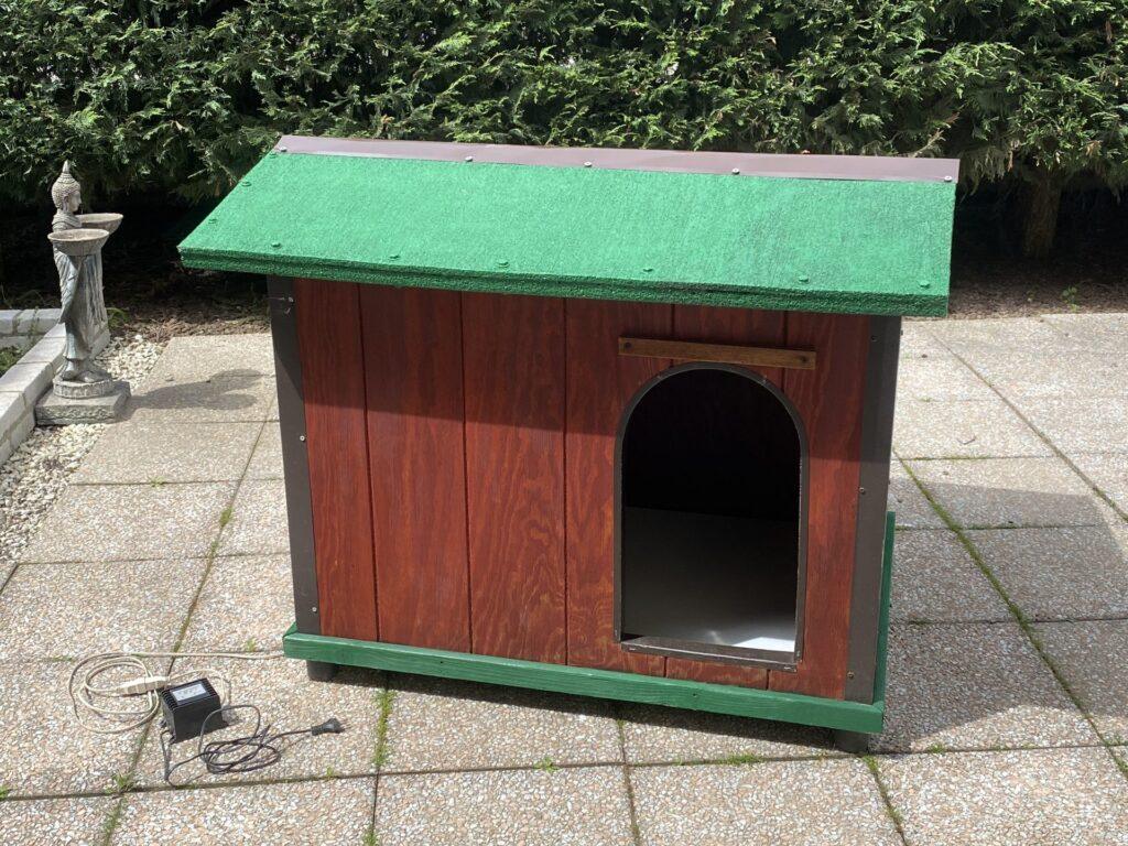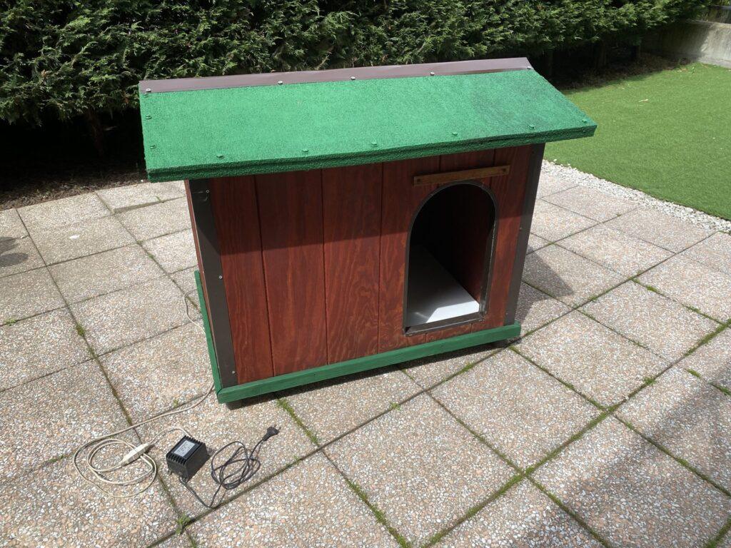 Pareti e tetto realizzati con pannelli compositi di sp. 3,5 cm, trattati con un procedimento antimuffa e pioggia, con intercapedine in polistirolo a isolamento termico + pedana riscaldata (fondo bianco interno della cuccia) con resistenza elettrica e trasformatore IN 230V – OUT 24V con potenza 60VA/50-60Hz/IP66, per riscaldare la cuccia nelle stagioni con climi rigidi o umidi.